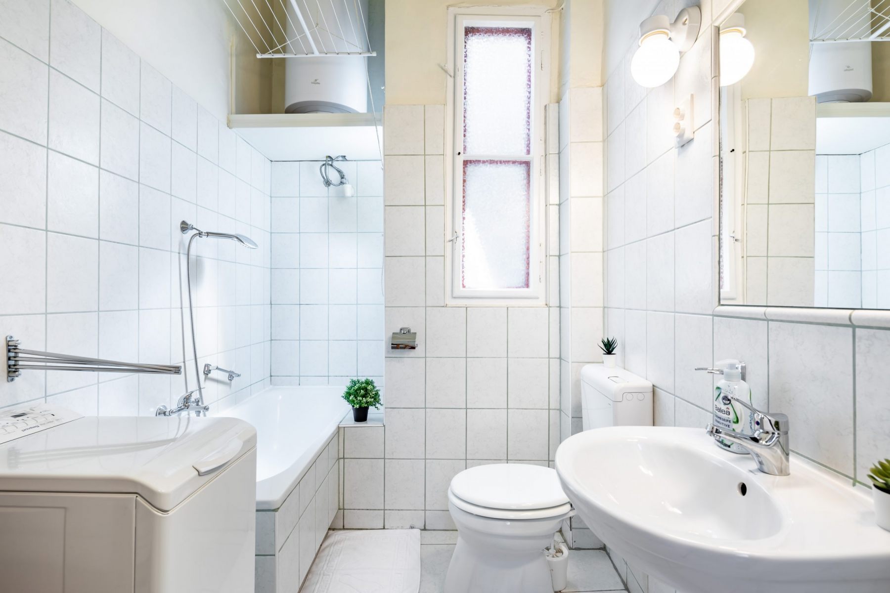Bathroom Our bathroom is equipped with a washing machine in case you need to clean your clothes easyly. You can also find a hair dryer here and a tub for warm baths or showers.
